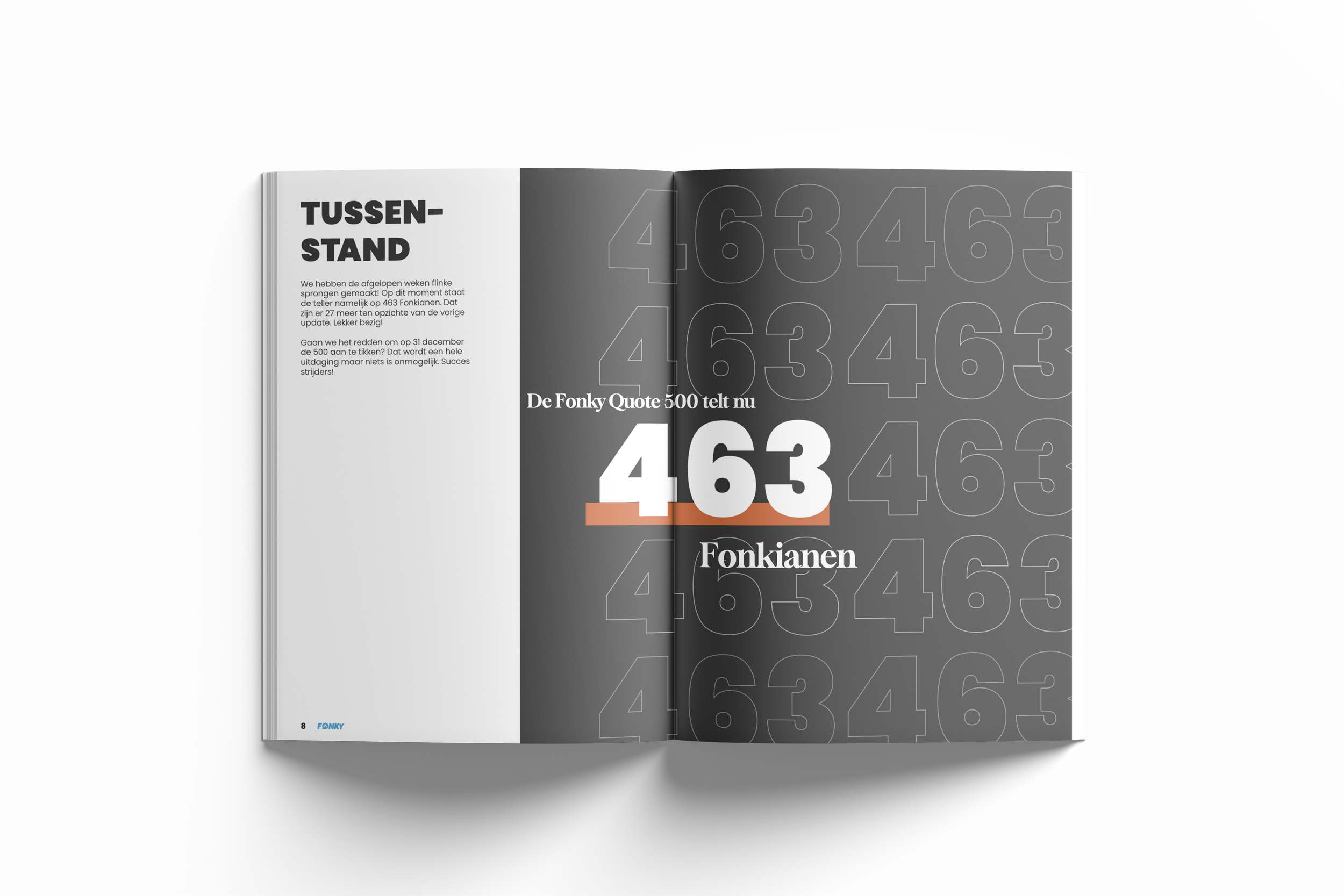 Fonky Quote 500 magazine is een magazine die extra aandacht moest vestigen op het behalen van de 500 medewerkers. Middels interviews, tussenstanden en leuke nieuwtjes lag de focus op de verbinding tussen de medewerkers om zo extra motivatie te wekken. Ik mocht het ontwerp van het magazine en de coverfoto op mij nemen. Scroll links door een greep uit deze spreads. .